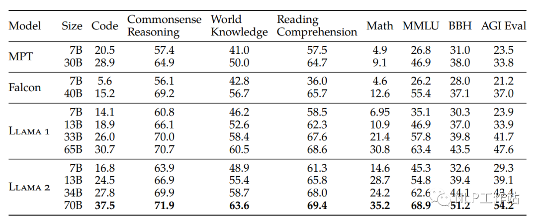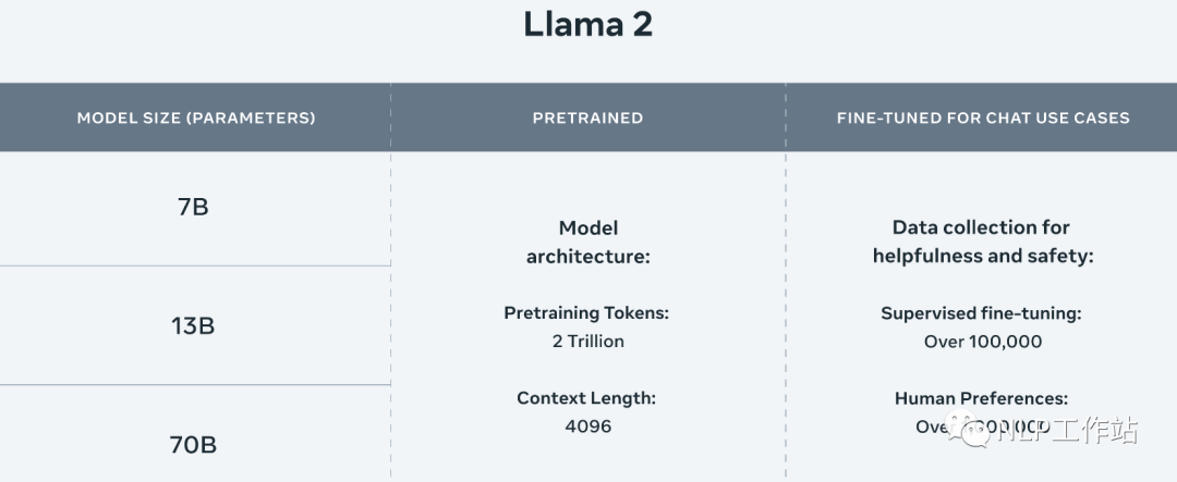 开源模型目前有7B、13B、70B三种尺寸,预训练阶段使用了2万亿Token,SFT阶段使用了超过10w数据,人类偏好数据超过100w。