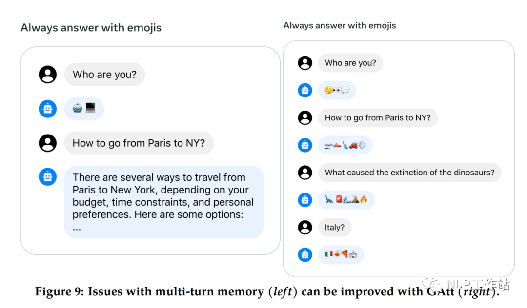 最初的RLHF模型在几轮对话后忘记最初的指令,下图(左)所示。为了解决这些限制,提出Ghost Attention方法(Gatt,其实是一个训练trick)来增强模型对指令的遵从。
