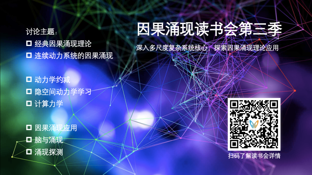 集智俱乐部因果涌现读书会目前已经进行了两季。第一季读书会系统地梳理了因果涌现的概念,以及它与Sloopy Model、复杂性阈值、自指等概念之间的联系,也探讨了因果涌现理论在复杂网络、机器学习中的应用。参看:因果涌现读书会启动:连接因果、涌现与自指——跨尺度动力学与因果规律的探索。第二季读书会探讨了涌现、因果科学和机器学习三大主题的融合,包括信息论拓展、因果涌现理论、因果表示学习、多尺度机器学习动力学建模。参看:因果、涌现与机器学习:因果涌现读书会第二季启动。