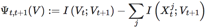 ,表示当前时刻的宏观态Vt能超过当前时刻的微观态Xt给下一时刻的整体系统Xt+1再多提供一些信息,存在因果涌现;