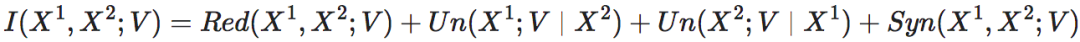 其中Red(X1,X2;V)表示冗余信息,是指两个微观态X1和X2同时给宏观态V提供的信息;│Un(X1;V│X2)和│Un(X2;V│X1)表示特有信息,是指每一个微观态单独给宏观态提供的信息;Syn(X1,X2;V)表示协同信息,是指所有微观态X联合给宏观态V提供的超过各自给宏观态提供的信息。