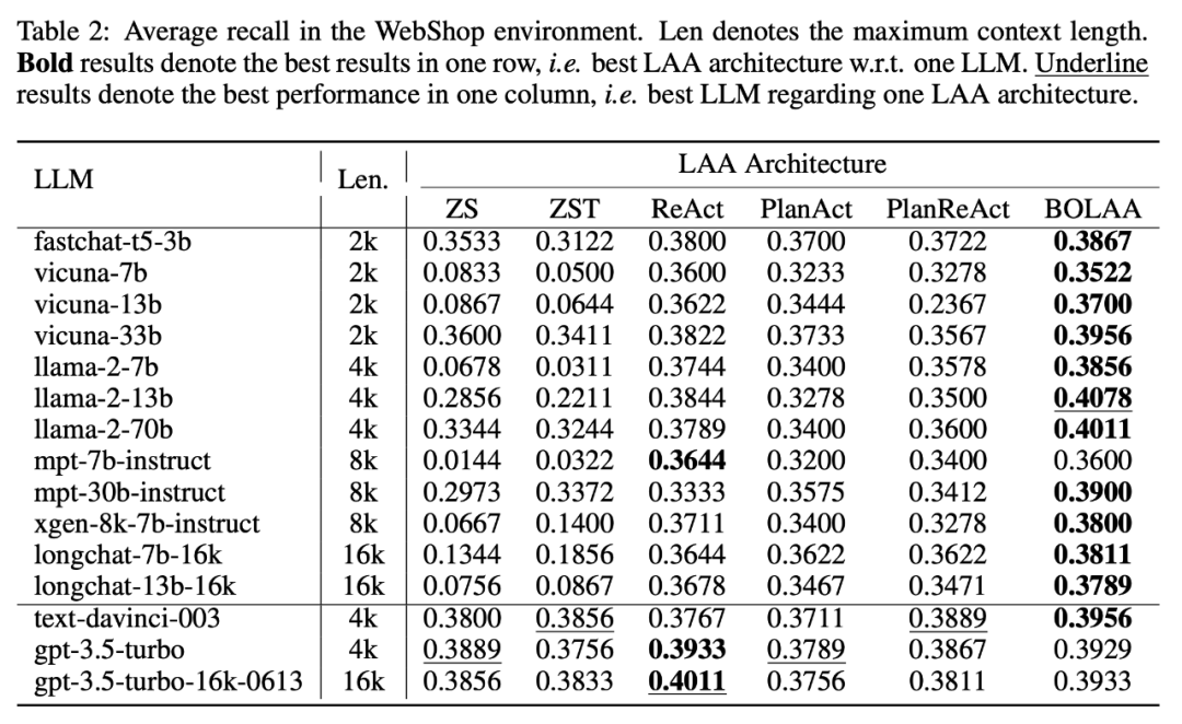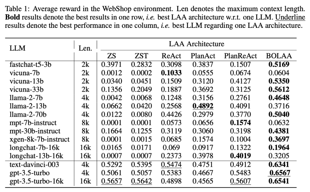 研究者比较了 WebShop 环境中 LAA 的决策性能。下表 1 列出了平均奖励方面的表现。Agent 提示是根据不同 LLM 模型的最大上下文长度构建的。关于 BOLAA,研究者设计了一个搜索 LAA 和一个点击 LAA,分别生成搜索查询和点击元素。观察结果如下: