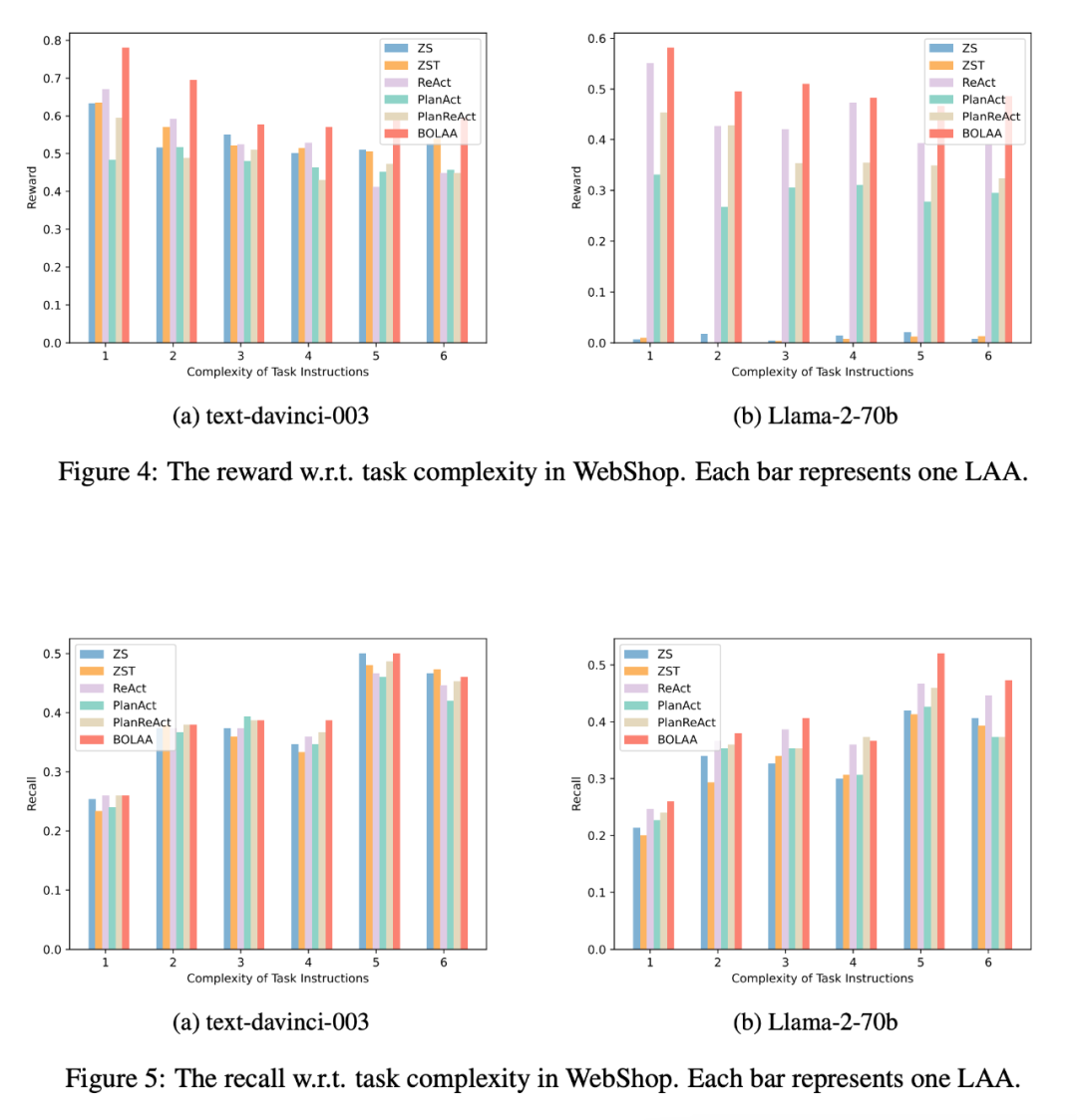 结果显示,与其他 LAA 架构相比,BOLAA 在 WebShop 环境中始终取得了最佳性能。这些表明了在解决复杂任务时多个专业 agent 的协作至关重要,可以说应该与训练具有强泛化能力的大型 LLM 同等重要。