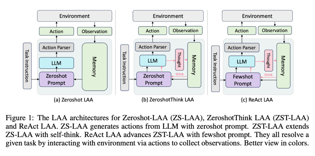 研究者建议全面比较 LAA 的性能,并深入探索了 LAA 的 agent 架构和 LLM 骨干。具体地讲,他们基于现有环境构建了 agent 基准,从而评估建构在不同 LLM 骨干之上的不同 agent 架构的性能。该 agent 基准中的任务还划分了不同的复杂程度,使得 agent 性能与任务复杂度的关联分析成为可能。