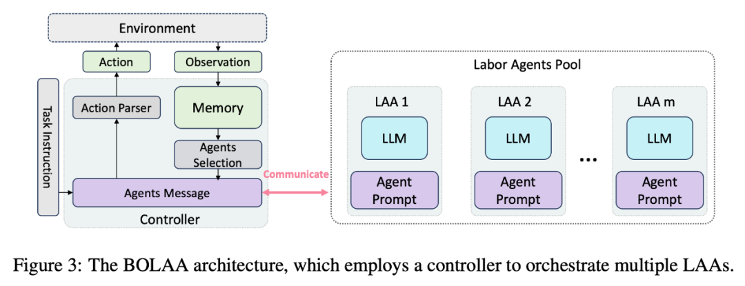 如图 3 所示,BOLAA 有两个主要模块,即分工 agent 池和控制器。