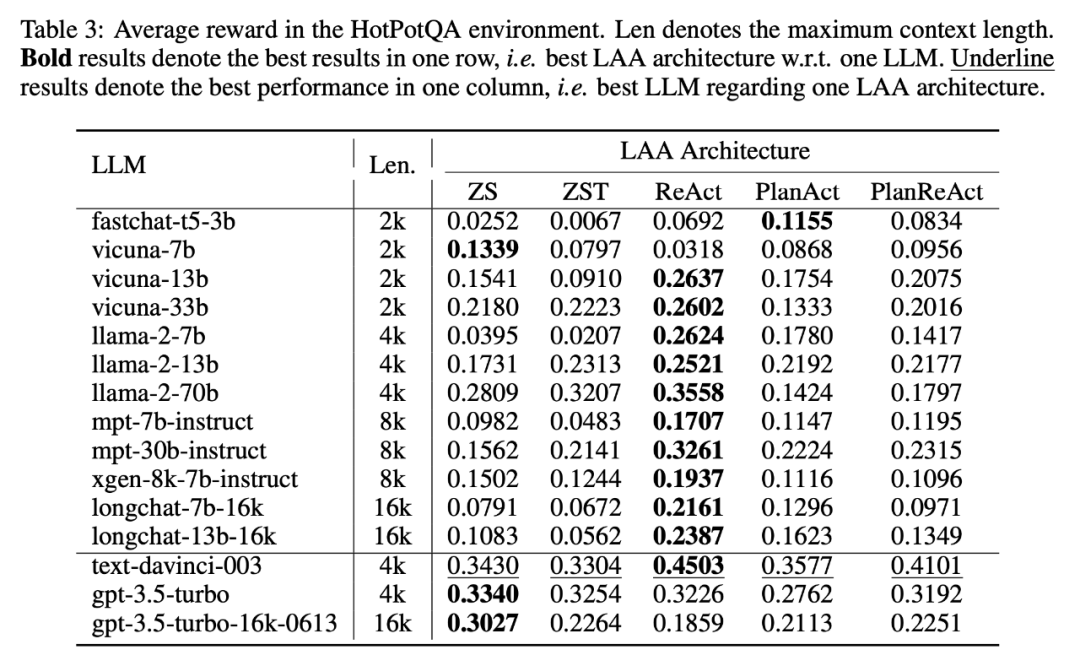 随后,研究者在 HotPotQA 环境中进行了基准测试,以评估 LAA 的多步骤推理能力。由于在该环境中,可用的搜索、查找和完成运算都与知识推理有关,很难分开,因此他们将 BOLAA arch 留待此后工作中使用,只比较其他 agent arch 的性能。结果如下表 3 所示: