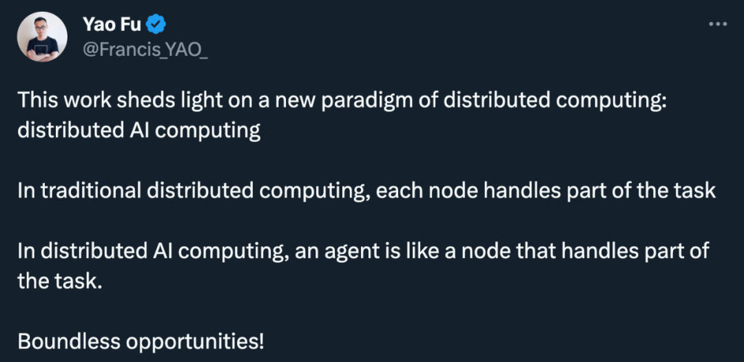 爱丁堡大学博士生符尧认为,这项工作揭示了一种新的分布式计算范式:分布式 AI 计算。在传统分布式计算中,每个节点处理部分任务;同样在分布式 AI 计算中,一个 agent 就变成了处理部分任务的节点。