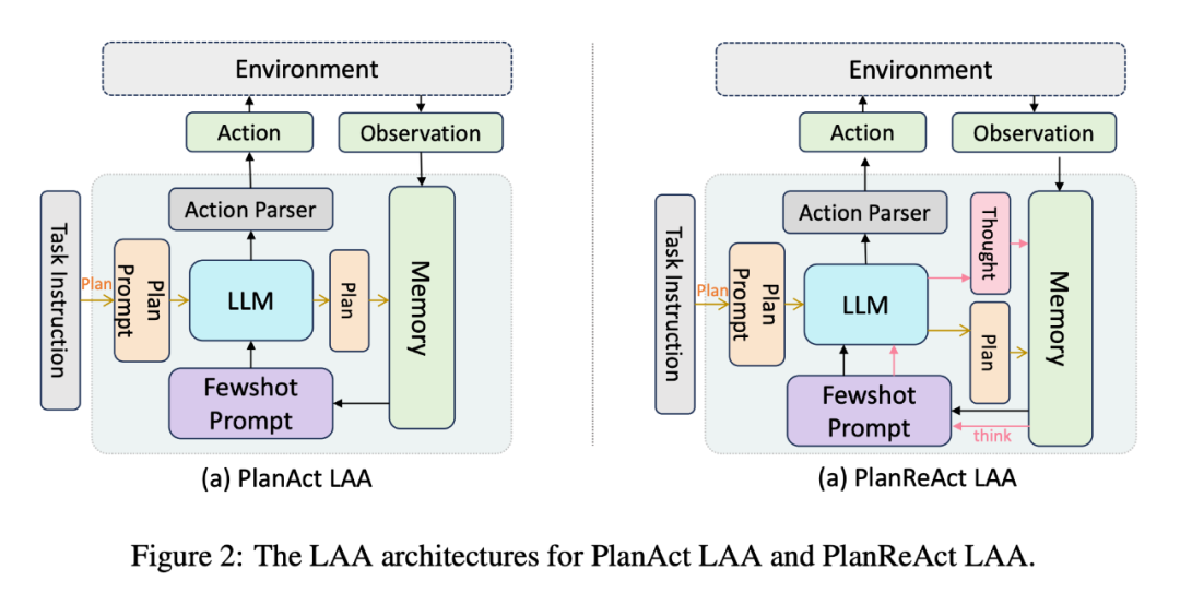 开发了 6 种不同的 LAA agent 架构,并将这些架构与不同骨干 LLM 结合,从而在提示、自我思考和规划中验证 LAA 的设计直觉。同时开发了用于编排多 agent 策略的架构 BOLAA,增加了单体 agent 的动作交互能力;