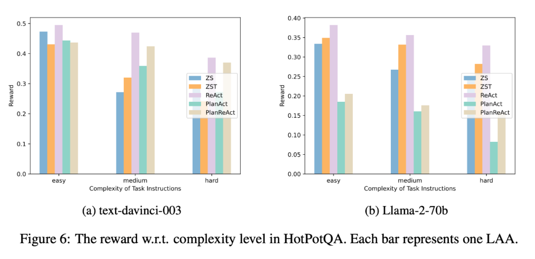在比较了 LAA 和 LLM 的总体性能之后,研究者对它们在任务复杂度方面的性能进行了更详细的研究,结果如下图所示: