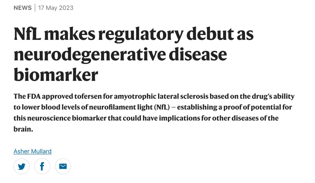 今天为大家介绍的是来自Asher Mullard的一篇关于tofersen的新闻。美国食品和药物管理局(FDA)根tofersen降低神经丝轻链(NfL)血液水平的能力批准了该药物用于治疗肌萎缩侧索硬化症,这为这种神经科学生物标志物的潜力提供了证据,并可能对其他脑部疾病产生影响。