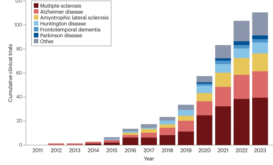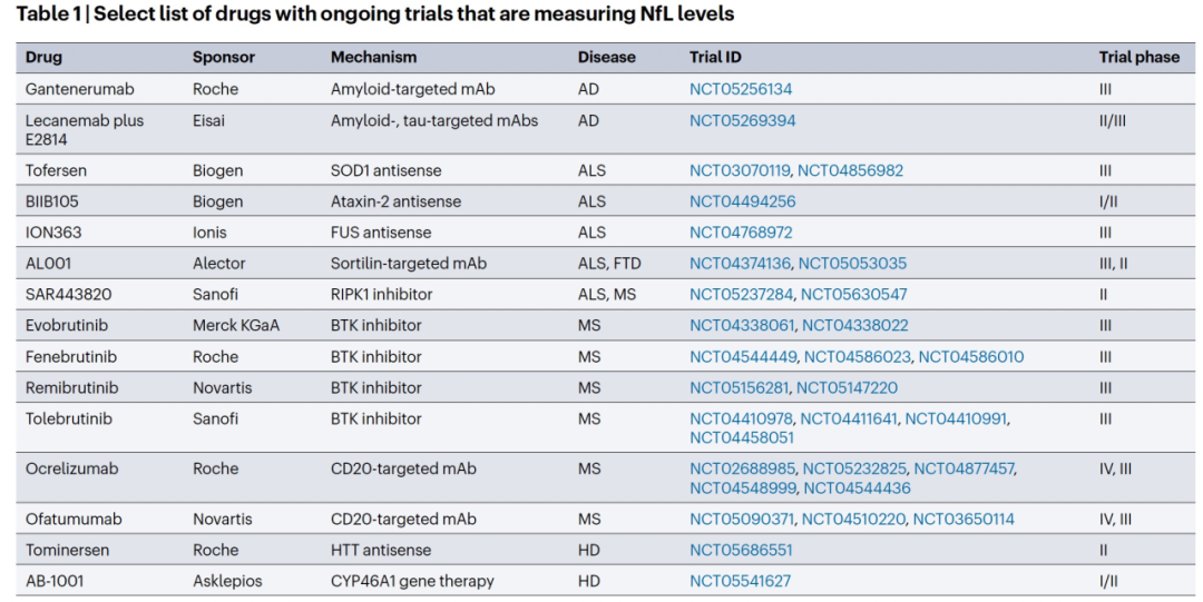 NfL是一种棒状细胞骨架蛋白,只在神经元中表达。当这些细胞受损或死亡时,它们会释放蛋白质到脑脊液和血液中。大约在10年前,研究人员找到了一种精确测量血液中NfL的方法,提供了神经元健康的快照。制药公司已经在100多个中枢神经系统疾病的药物试验中将NfL水平作为终点进行使用,包括多发性硬化症(MS)、阿尔茨海默病和亨廷顿病(图1,表1)。现在,随着NfL的监管先例已经确立,这项研究的速度将加快。