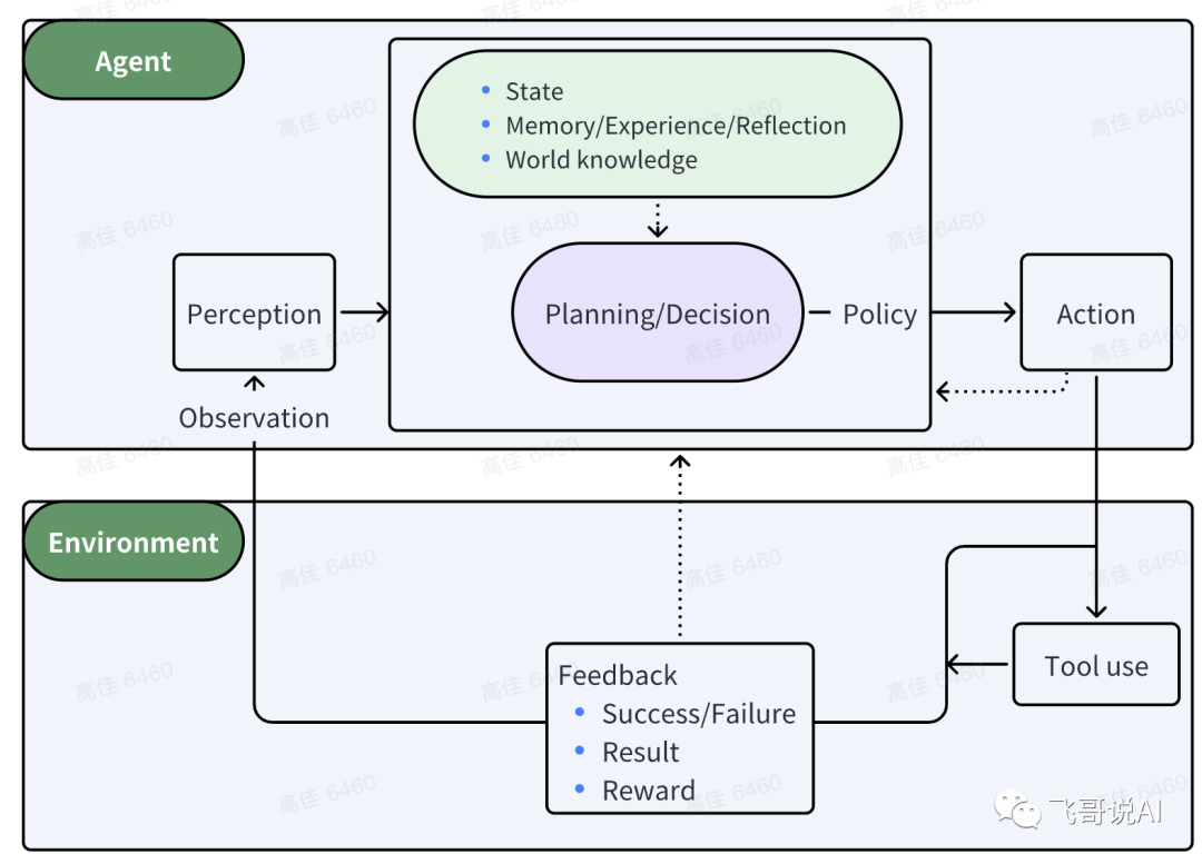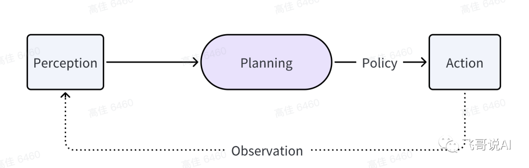 感知(Perception)是指Agent从环境中收集信息并从中提取相关知识的能力,规划(Planning)是指Agent为了某一目标而作出的决策过程,行动(Action)是指基于环境和规划做出的动作。