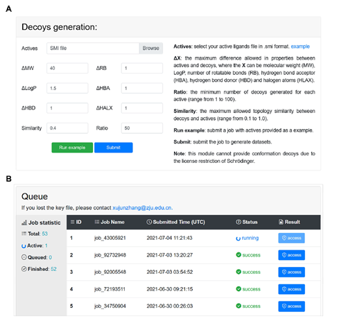 为了方便药物设计工作者在其它并未收录在ToCoDDB数据库中的靶点上测试他们选用的筛选模型性能,作者提供一个网络服务器(图3)可以根据用户上传的已知活性分子的SMILES产生基于拓扑结构的阴性样本,用户同时还可以指定所需要的理化性质和相似性阈值限制。不过受限于Glide使用许可,这个服务器无法产生构象阴性样本。