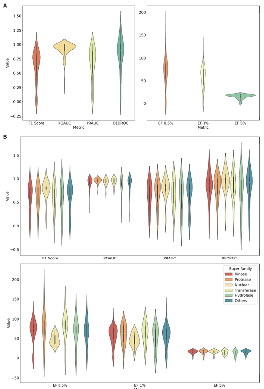 图2. 利用ToCoDDB训练并测试了IGN模型的表现。A. IGN在所有靶点上测得的指标分布;B.IGN在不同蛋白家族上的测试指标分布。