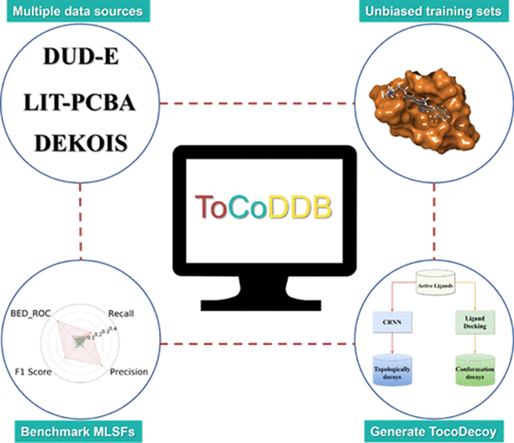 基于机器/深度学习的打分函数普遍在现有的虚拟筛选测试集上具有极好的测试指标,因此普遍认为这类模型比经典打分函数具有更好的准确性。然而,现有的虚拟筛选数据集如DUD-E等最初都是为了评估传统打分函数设计的,且其中存在的一些潜在偏向性,并不完全适合训练和测试基于机器/深度学习的打分函数。为了解决这些问题,浙江大学侯廷军教授课题组提出了一套新的基于已知活性分子产生阴性样本的方法ToCoDecoy,并基于该方法构建了一个用于训练和测试机器学习打分函数的数据集ToCoDDB,相关工作发表于美国化学会出版的药物化学核心期刊Journal of Medicinal