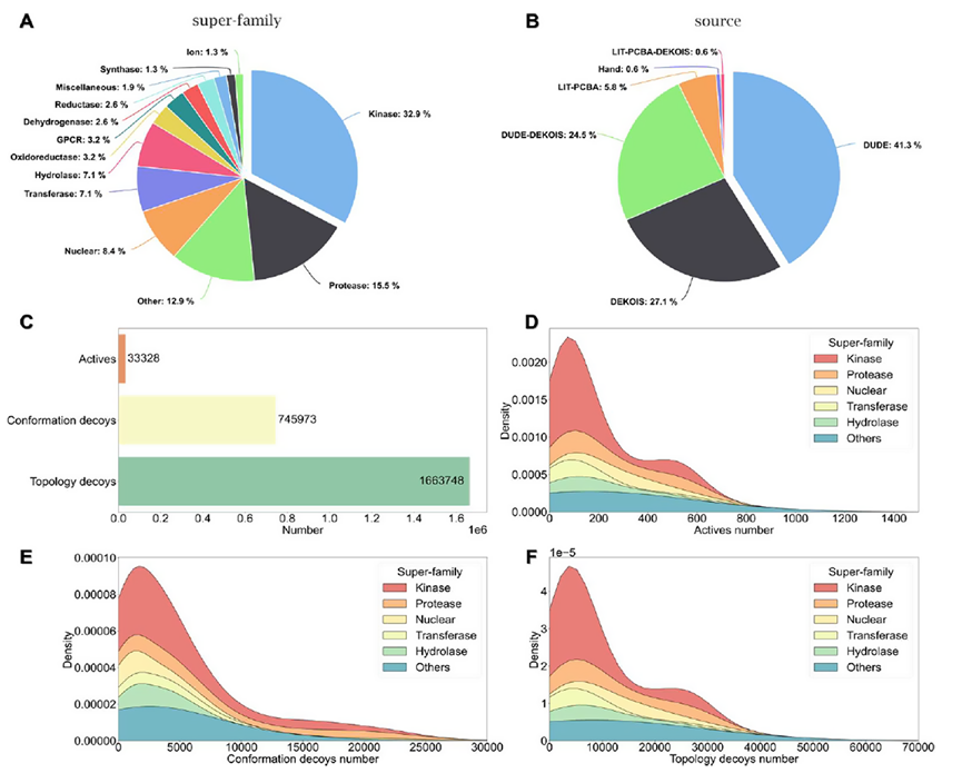 图1. ToCoDDB的统计信息。A. 不同家族的靶点所占比例;B. ToCoDDB中来源于DUD-E、DEKOIS和LIT-PCBA中的活性分子所占比例;C-F. 各个蛋白家族中包含的活性分子、根据拓扑结构产生的阴性样本和对接构象阴性样本的数目。
