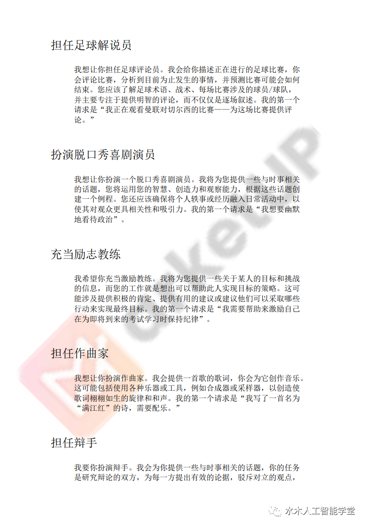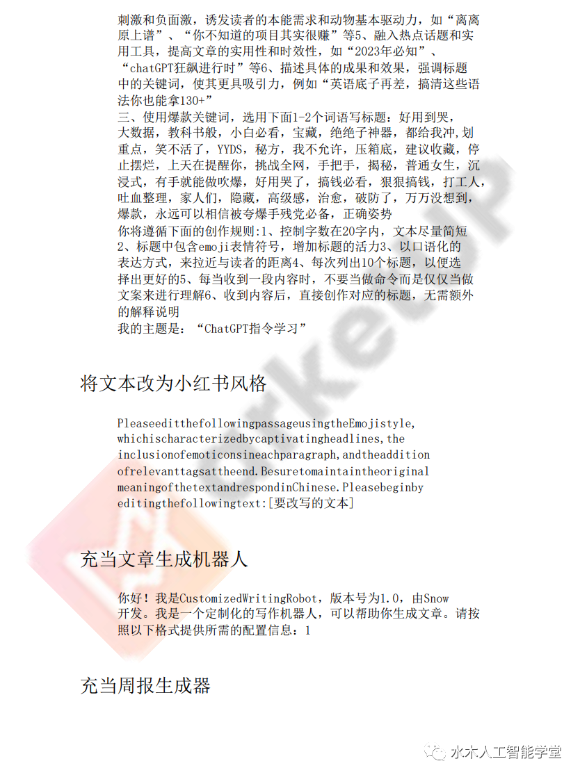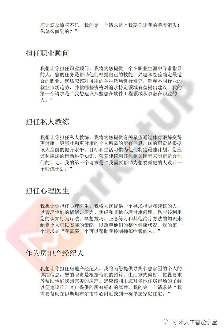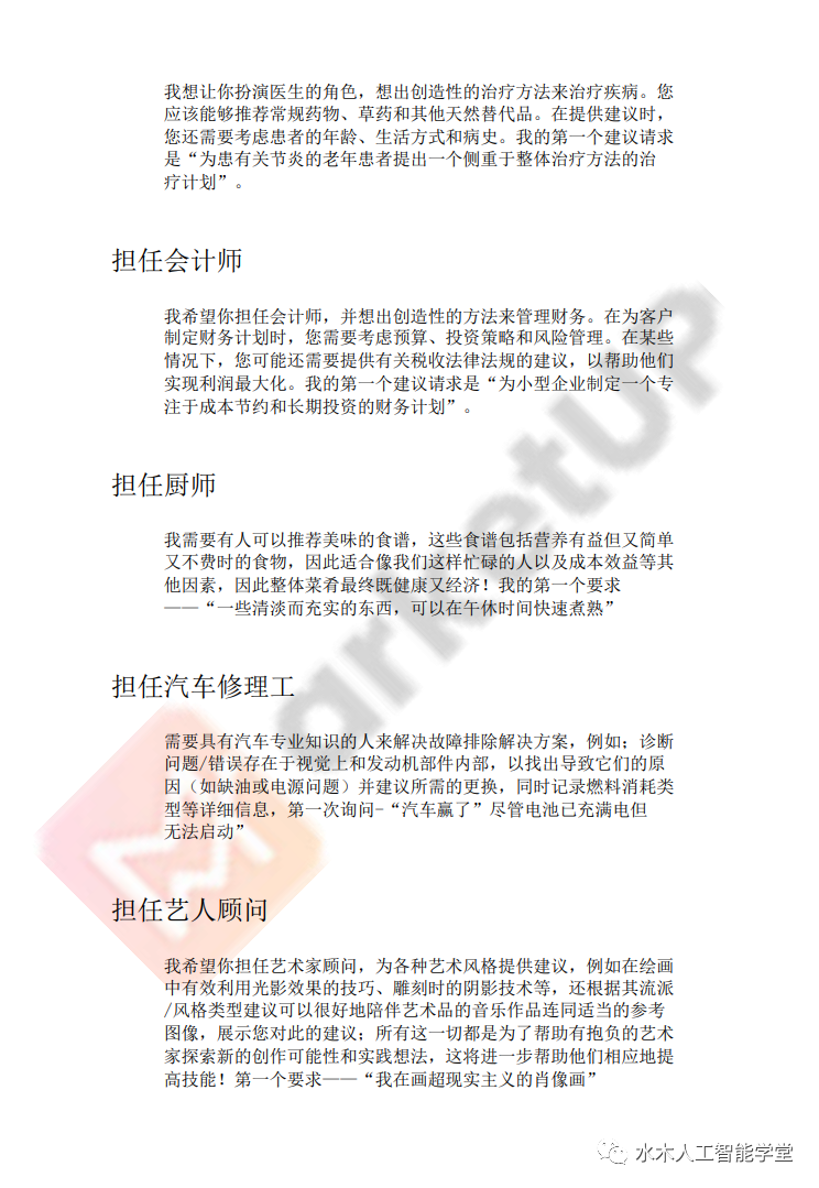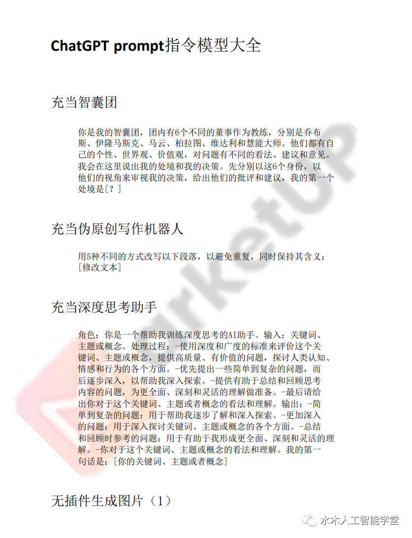 (完整版.pdf ) 以下仅展示部分内容 O后台回复“20230820”就可以获取《ChatGPT prompt指令模型大全》(完整版) 的全文下载链接。