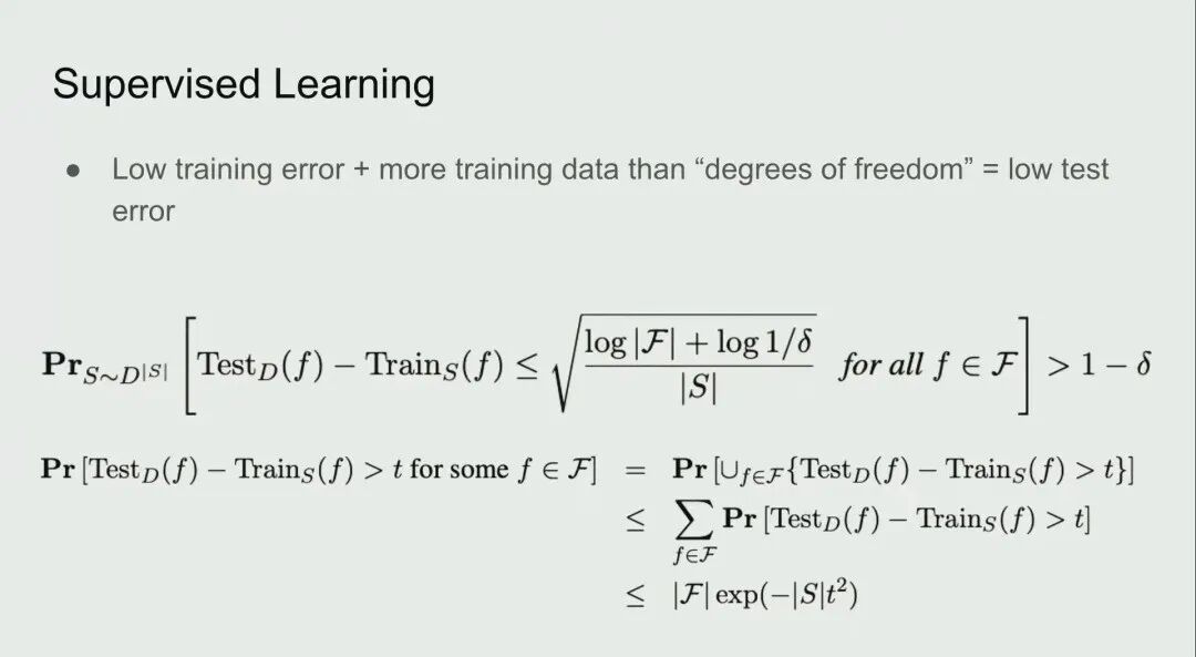 我们明白了监督学习为什么有效,以及语音识别、图像分类等为什么能够实现,它们都可以归因于监督学习,且监督学习具备这种数学保证,这非常好。对于那些关心 VC 维度(VC dimension)的人,许多关于统计学习理论的文献都强调 VC 维度是一个关键的组成部分,但实际上, VC 维度仅仅是为了让模型能够处理有无限精度的参数。