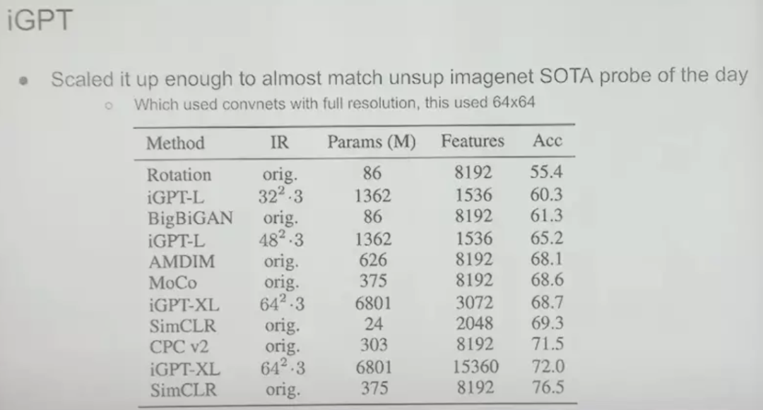 通过实验,在 ImageNet 上,我们发现经过多方面扩展的 iGPT 的表现可以接近当今最佳的监督学习,但依然有一定差距,不过这只是一个计算问题,因为后者使用的是大型高分辨率图像,而我们在巨型 Transformer(拥有60亿参数,按照现在的标准不算大,但在当时算是庞大的模型)上使用的是相对较小的 64x64 像素图像。因此,这种方法就像是在大型图像数据集上以无监督的方式预测下一个像素,并在 ImageNet 上拟合线性探头,从而得出很棒的结果。在 CIFAR-10 数据集上,使用这种方法可以达到 99% 的准确率。尽管这是 2020 年取得的成就,现在可能存在其他更高级的方法,但在当时,这个结果非常理想。
