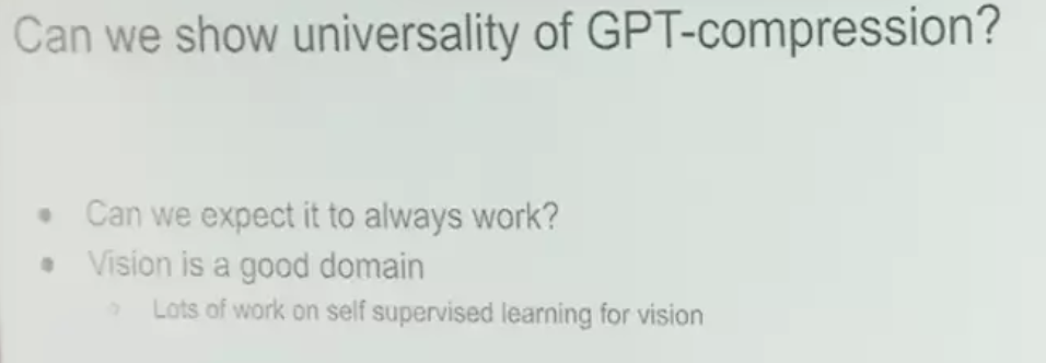 问:你提到了将压缩作为理解和推动无监督学习的框架。同时,你在最后提到,如果将这个框架应用于语言模型的下一个词预测,可能会有些表面,因为任何文本任务都可以转换为下一个词预测任务。因此,对于文本任务来说,无监督学习在表面上与监督学习有些相似。然而,图像 GPT 无法像预测下一个像素那样明确定义文本任务,但我们可以利用线性表征,展示压缩可以形成良好的无监督学习。不过,高度有效的压缩器可能无法提供有用的线性表征。因此,我想知道是否存在无监督学习和监督学习表面上并不相同,但无需压缩器提供有效的线性表征以证明压缩是一个良好的无监督学习目标的情况。
