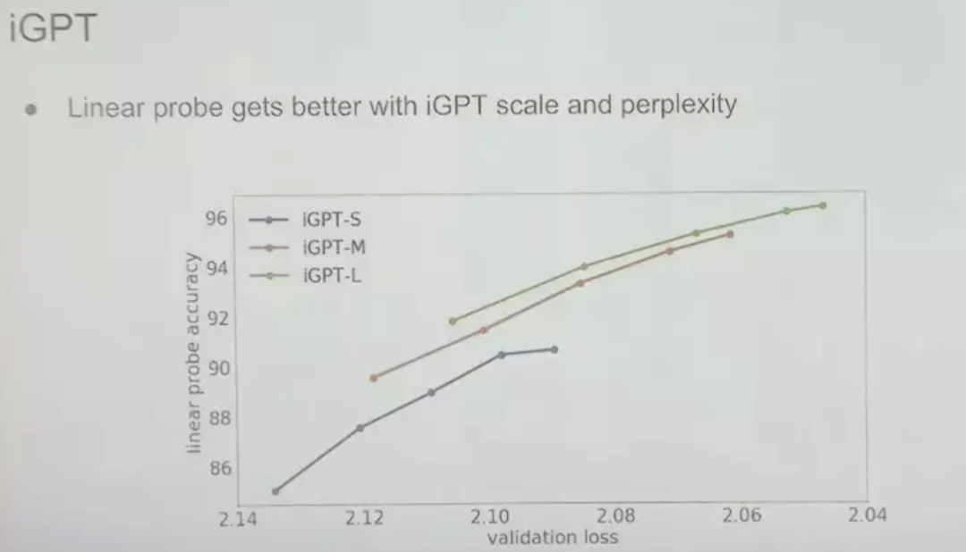 这是不同大小的 iGPT 模型在像素预测任务中的下一步预测准确率。竖轴是神经网络最佳层上的线性探头精度(linear probe accuracy),我们在其中加入线性分类器,并查看运行情况,然后就得到了上图三条不同颜色的曲线,三条曲线间的差距逐渐缩小,趋于相似。这就是我们所期望的结果,这表明,像素预测与下一个单词预测同样有效,同时这种方法还能提升模型在无监督学习方面的表现。