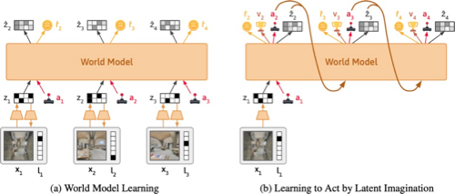 左:世界模型在每个时间步将文本和图像压缩为潜在表征。在这个表征中,模型被训练以重构原始观察结果,预测奖励,并预测下一个时间步的表征。直观地说,世界模型学会了在给定文本中所读内容的情况下,应该期望在世界中看到什么。