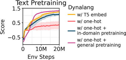 模型在通用文本数据(TinyStories,200万个短故事)上进行预训练之后,可以提高Messenger下游RL任务的表现,甚至超过了使用预训练的T5嵌入。
