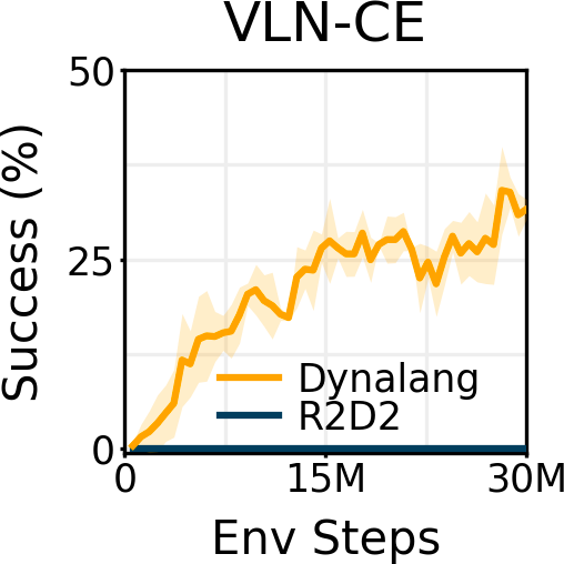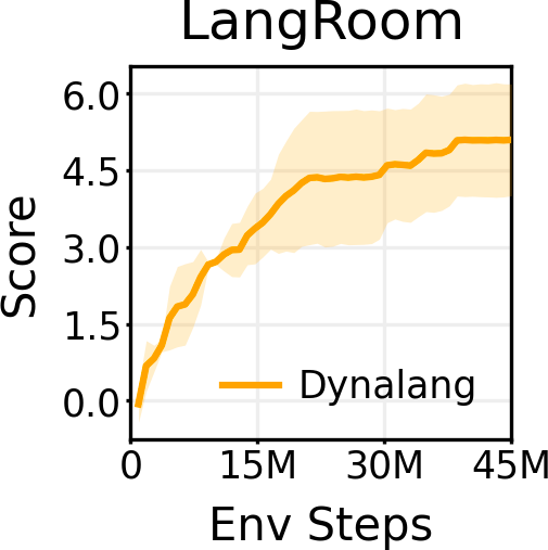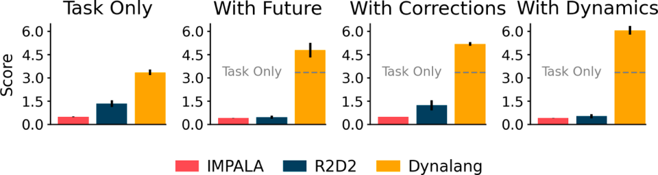 结果显示,Dynalang要明显优于以语言为条件的IMPALA和R2D2。