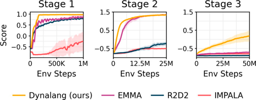 结果显示,Dynalang的表现要明显优于IMPALA和R2D2,以及使用专门架构对文本和观察结果进行推理任务优化的EMMA基准,尤其是在最困难的第3阶段。