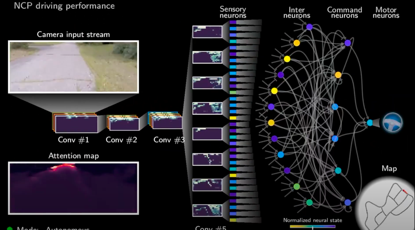 受生物学启发用少量神经元实现无人驾驶:系统控制部分(NCP) ,将感知模块中的数据转换成操纵命令,仅由19个神经元组成——“数量级比之前最先进的模型小得多”。