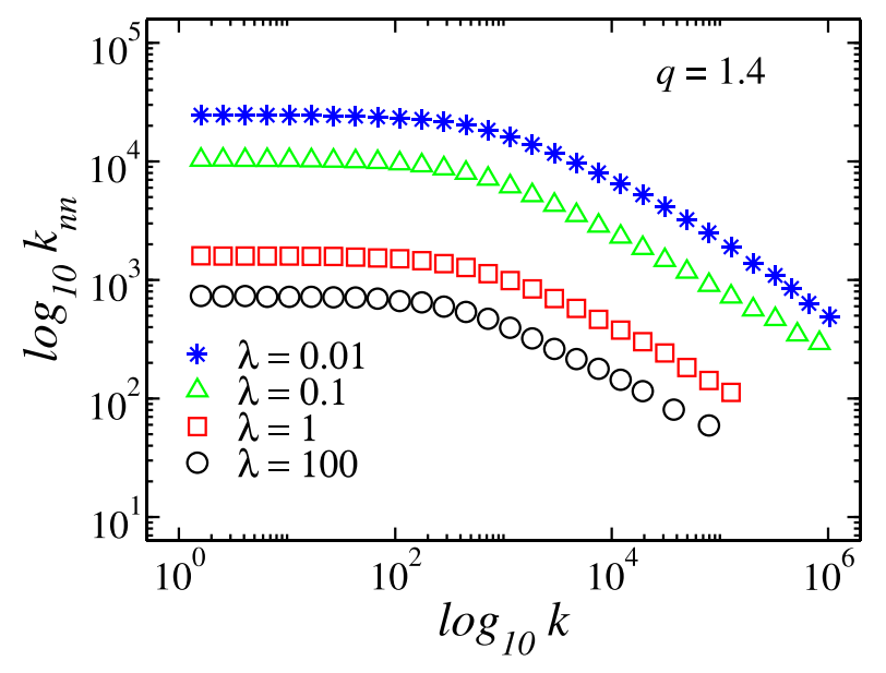 图3. 在节点数为 和 、 、 和 的网络中,节点的平均近邻度 与度 的关系。每条曲线的平坦区对应于 。对于足够大的 值,所有曲线都指向内在的异配行为。