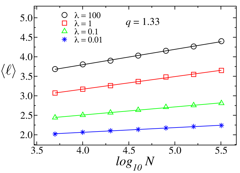 图4. 和 、 、 和 时平均最短路径长度 与节点数量的依赖性。