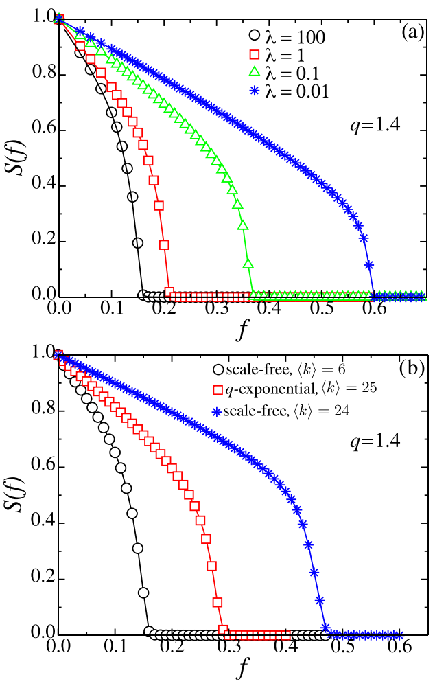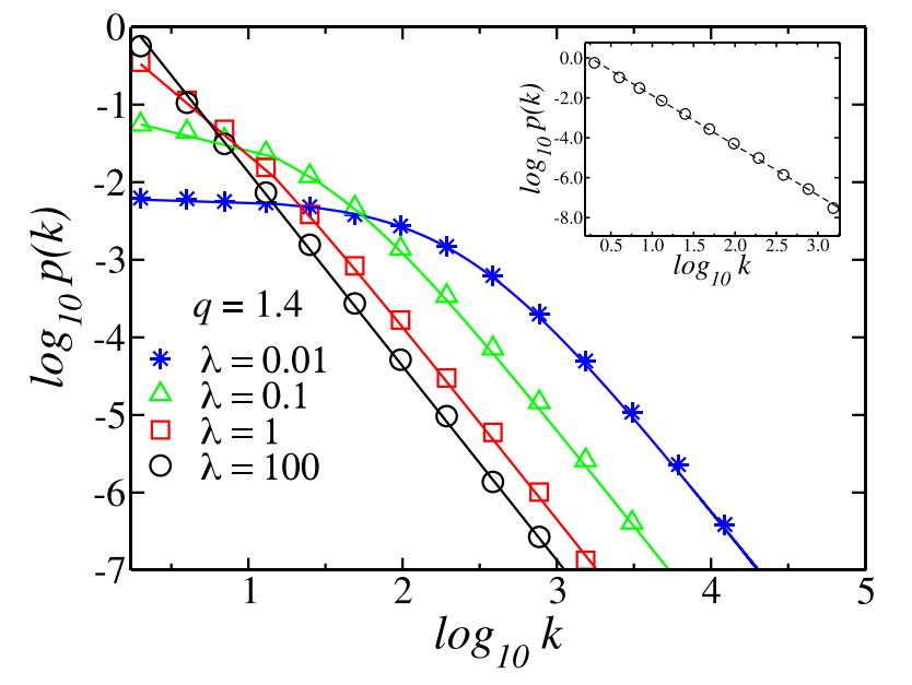 有两个参数: 和 。它是幂律分布的一般化,因为对于大的 ,它的衰减方式类似于 。然而,对于较小的度数 ,它趋向于高度为 的平坦分布。因此,参数 决定了这两种状态之间的交叉。式(1)中的分布是广义恒温统计数学形式及其应用的基本要素。虽然在重尾分布的复杂网络中观察到的大多数性质都是由尾部形状决定的,但在较小的度数上偏离幂律会改变连接最少的节点的出现,从而导致结构变化,影响这些网络的主要性质和过程。