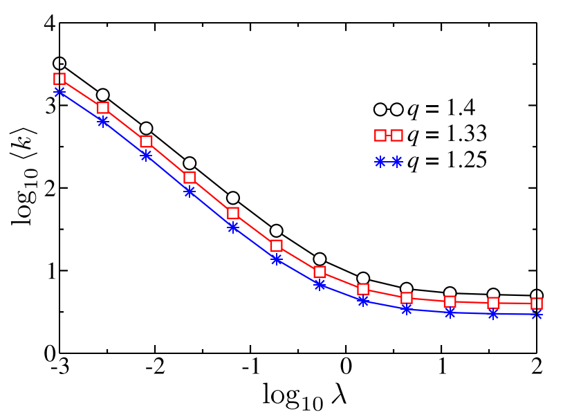 图2. 在不同的 值下,平均度 与参数 的关系。这些曲线分别对应于 、 和 。对于 的值,平均度遵循 ,正如 指数分布所预期的那样。在纯幂律极限下 ,平均度饱和于一个与 无关的值。