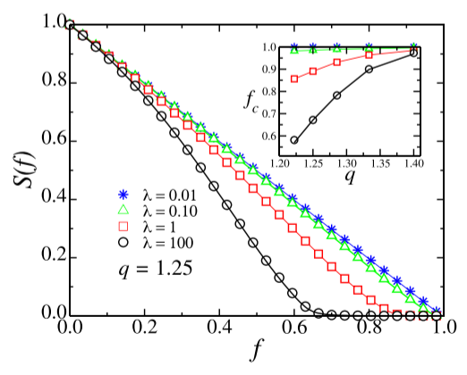 图6. 在 和 的 指数网络中,随机故障时最大集群 中的节点比例与被移除节点比例 的函数关系。通过对200个样本取平均值,这些结果对应于大小为 的网络。对于 ,黑色实线对应的是纯无标度网络随机攻击的结果。插图显示了根据Molloy-Reed标准确定的临界分数 。