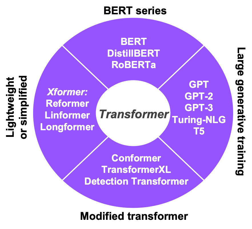 根据具体模型架构和应用的不同,研究者将 Transformer 家族的模型分为四大类(如图 5):
