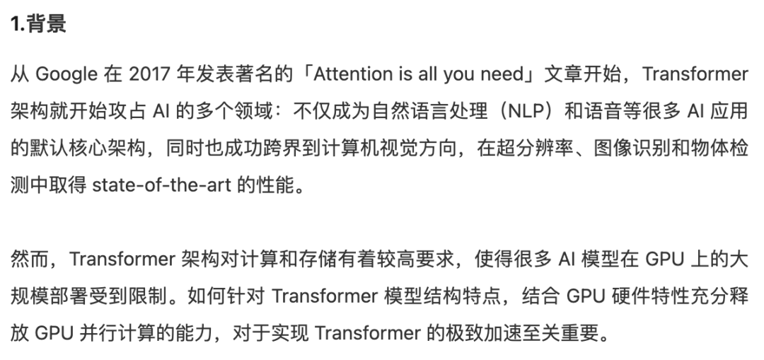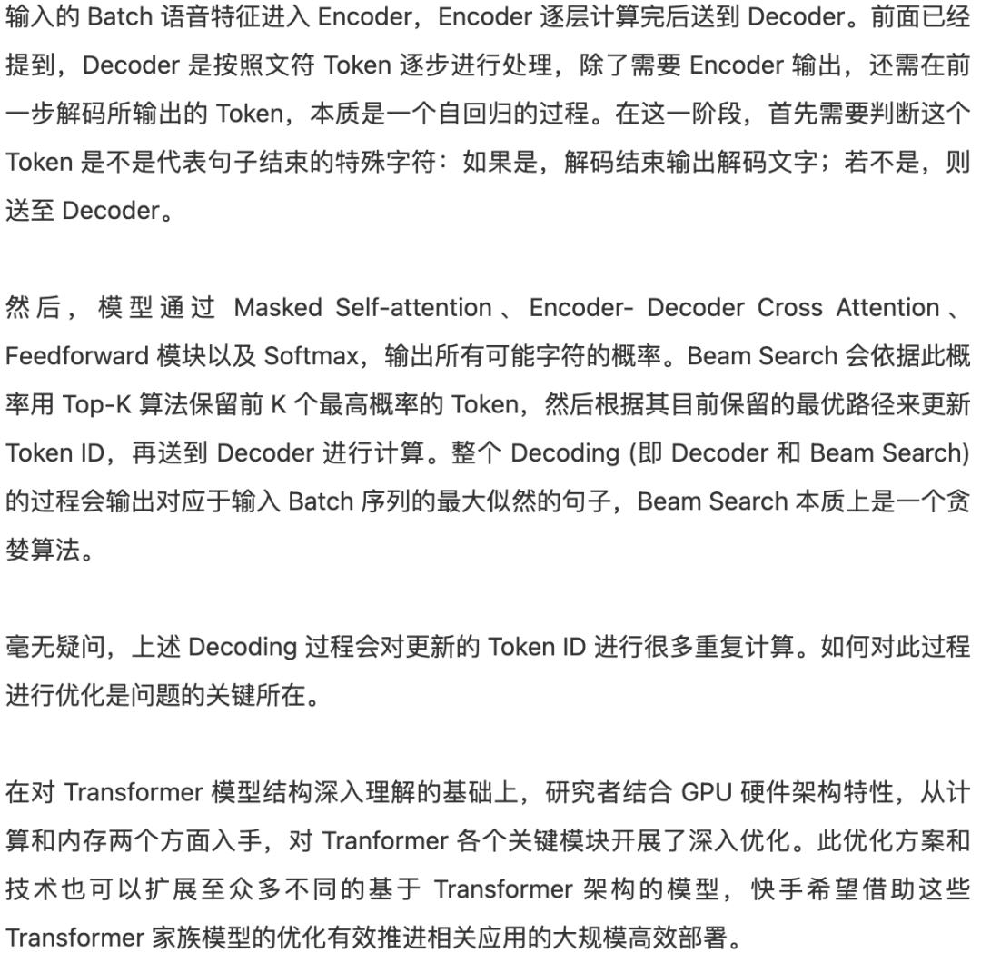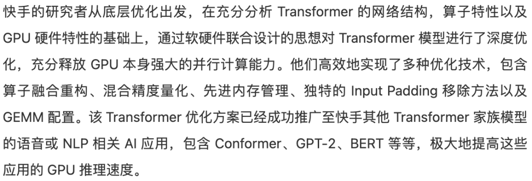 Transformer 对计算和存储的高要求阻碍了其在 GPU 上的大规模部署。在本文中,来自快手异构计算团队的研究者分享了如何在 GPU 上实现基于 Transformer 架构的 AI 模型的极限加速,介绍了算子融合重构、混合精度量化、先进内存管理、Input Padding 移除以及 GEMM 配置等优化方法。