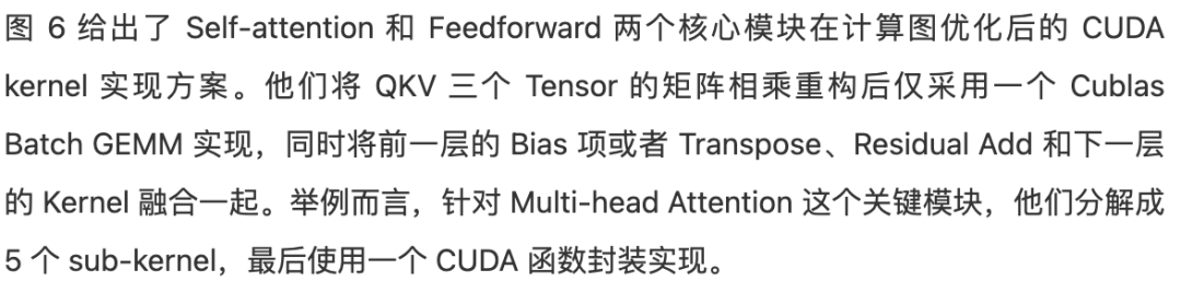图 6:Transformer 架构中 Self-attention 和 Feedforward 模块的 CUDA kernel 融合和重构,参见[14]
