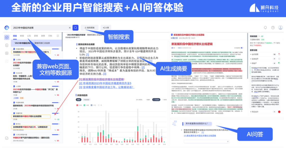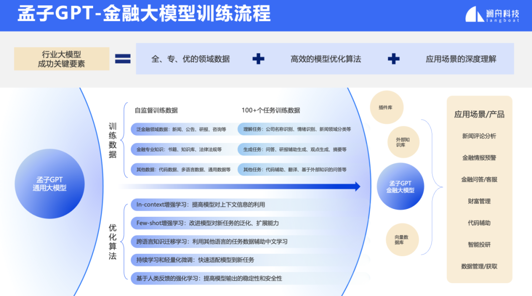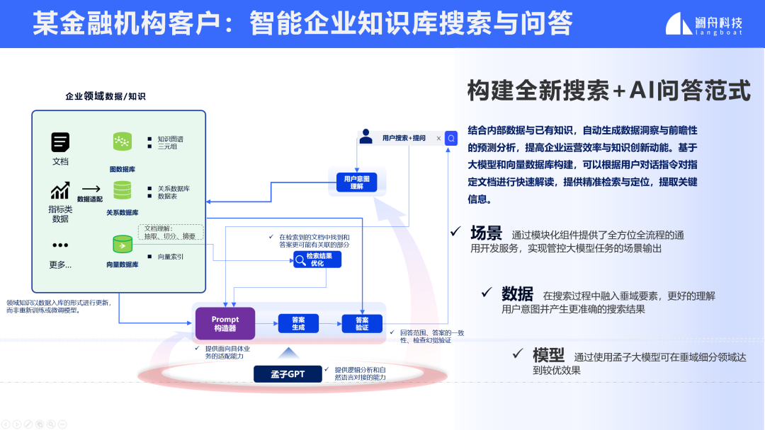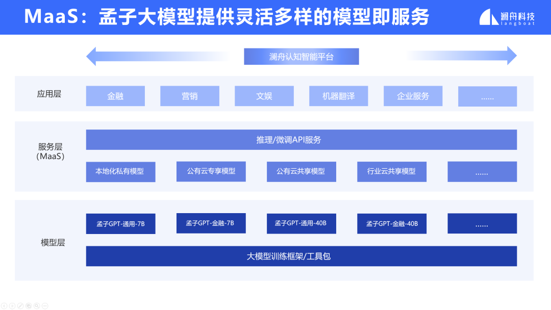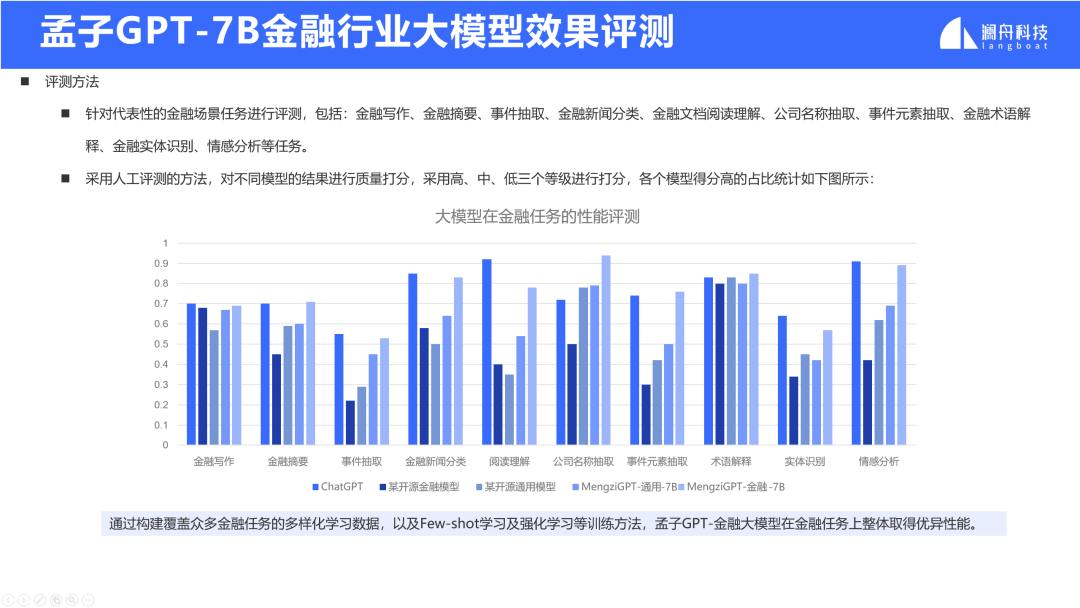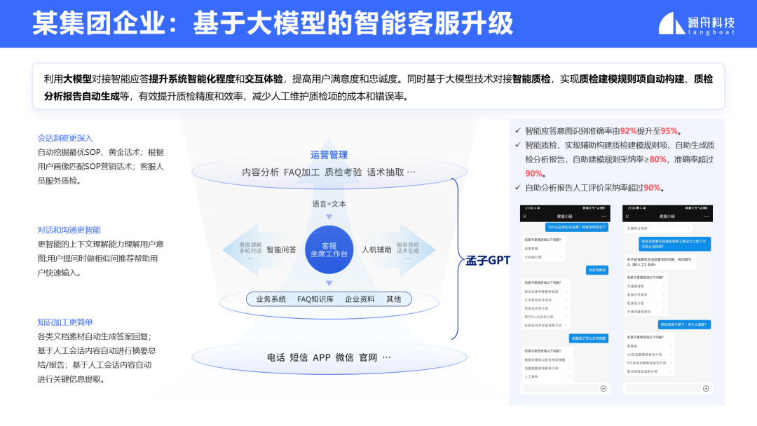在业务落地实践中,孟子GPT-40B已成功助力某集团企业完成智能客服体系升级。银行、资管、基金、券商等金融机构一直是人工智能技术应用的主战场,其中自然语言处理(NLP)的应用场景也非常丰富。随着大语言模型的流行,大模型在金融行业的业务场景中展现出了更多可行性和潜力。澜舟科技在过去两年持续深耕大模型赋能金融行业的场景。基于孟子GPT通用大模型底座,孟子GPT金融行业大模型整合了更多泛金融领域的数据和专业知识,并定义了100多个任务。通过优化算法,成功继承了底座的通用能力,并在金融行业的领域任务上获得了更出色的表现。技术的积累源于实践,而应用于实践更为重要。孟子金融行业大模型目前正在积极与一些客户合作,利用大模型技术合作针对企业的业务瓶颈实现更大的价值突破。例如,通过面向企业知识库的智能搜索和AI问答等技术,充分利用大模型的语言理解、内容摘要和文本生成能力,可以有效提升企业员工的工作效率。大模型面向企业客户落地的过程中,总会有一些特定的场景需要更加聚焦来实现,例如基于金融行业路演会的会后内容分析场景, 澜舟科技推出一款创新产品-澜舟智会。澜舟智会是一款面向企业用户的端到端会议内容分析平台产品,集成了全文摘要及关键问答提炼、会议要点智能导航、全文意义搜索和问答、大模型优化的语音转录等功能。通过发布会现场的视频演示,澜舟科技生动地展示了“澜舟智会”的魅力。总的来说,澜舟科技在人工智能技术领域取得了显著的成果。其推出的孟子大模型产品系列以及澜舟智会会议内容分析平台等创新产品将在企业数字化转型和智能化升级方面发挥重要作用。企业应用大模型不要盲目追风口,而是要从自身需求出发,让大模型真正结合业务,提升效能,创造价值。孟子大模型提供灵活多样的模型即服务(MaaS),面向企业用户提供免费MChat对话机器人体验、免费开通孟子大模型的API服务、同时提供云上私有化部署以及本地化部署。登录 langboat.com 即刻申请免费体验,欢迎在线联系商务洽谈。针对此次发布会,澜舟科技创始人兼CEO周明博士表示,“在企业的数智化道路上,通用大模型和行业大模型都非常重要,通用大模型像是底座,提供未来的可能性,行业大模型更重视业务应用。而我们在做的就是把行业伙伴的最后一公里做起来,结合业务场景,实现真正的价值落地。最近我们的孟子大模型在C-Eval和SuperCLUE榜单评测中,相继都取得了很不错的成绩,未来,我们也会继续努力,不断优化和完善我们的大模型,与行业伙伴紧密合作,共同推动人工智能技术在各个领域的应用和发展。”最后,再次祝贺澜舟科技孟子大模型系列及澜舟智会产品发布会圆满完成。未来,澜舟科技也将持续投入到大模型赋能千行百业的业务实践中,助力企业实现数智化。长期招贤纳士(含实习)