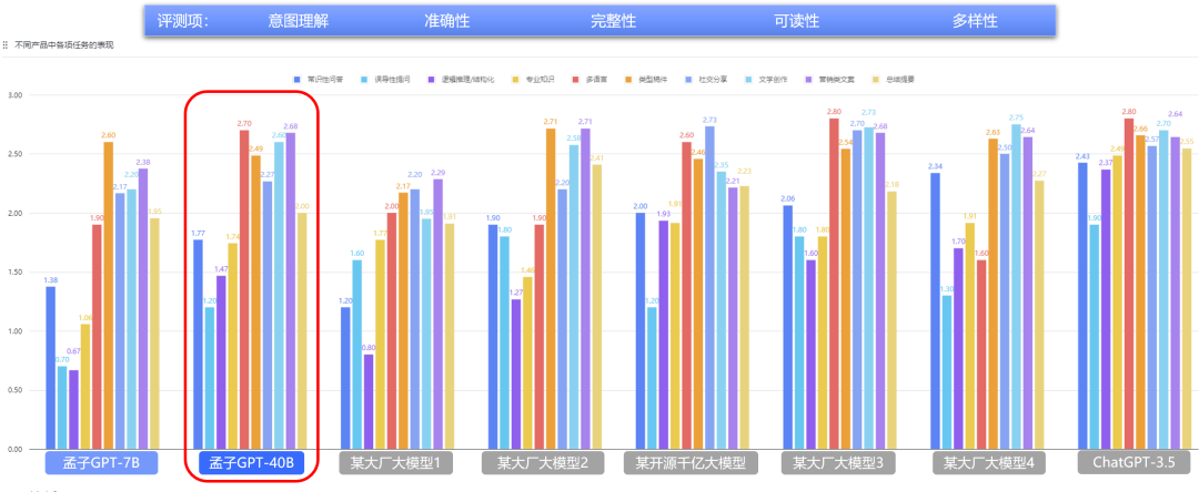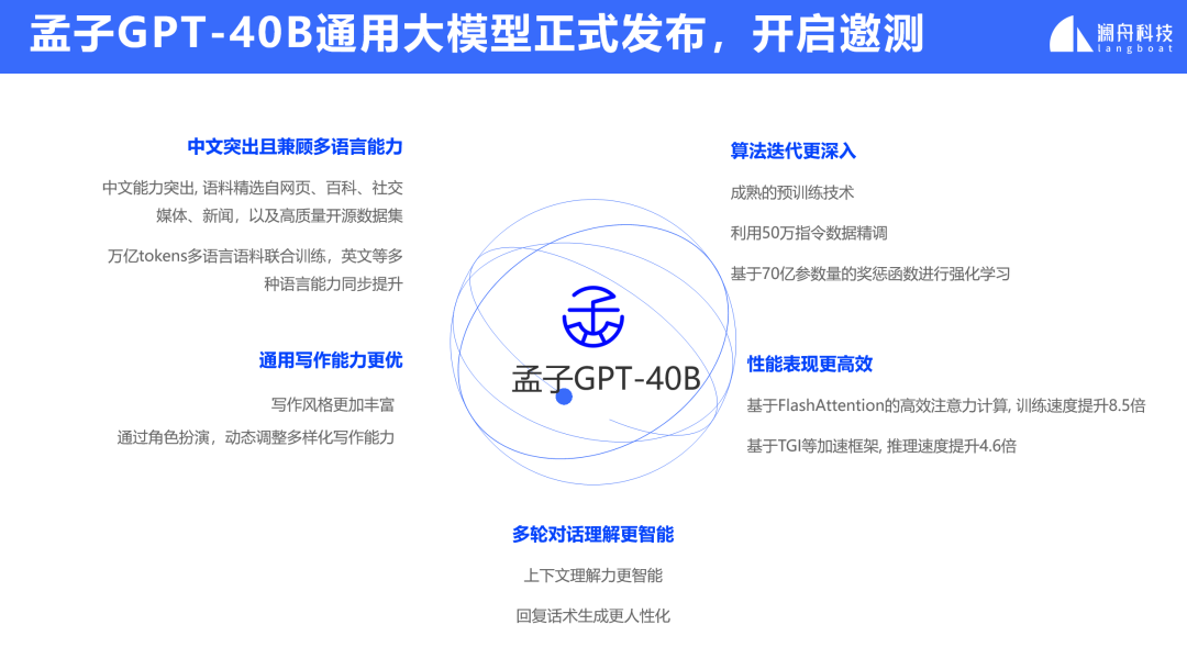 总的来说,AI Agents的搭建立足于L1-L3各层模型的能力,孟子大模型此次在各级产品体系分别推出新品,真正实现完整的大模型赋能企业应用的闭环。现如今,众多大型模型争相涌现,只有真正强大的实力才能成为衡量模型能力的标准。澜舟科技的孟子大模型最近在中文大语言模型测评榜单C-Eval中荣获榜首。孟子大模型除了具备标化考试的能力,也同样具备了足够成熟的商业化输出的实力。接下来,将重点介绍几款正式发布的模型。孟子GPT-40B通用大模型是一款拥有400亿参数量的大语言模型,本次升级主要基于70亿参数量的奖惩函数进行强化学习,并利用50万指令数据精调等更加成熟的预训练技术。在中文及多语言能力、通用写作、多轮对话等方面都有了大幅提升。性能表现方面,基于FlashAttention的高效注意力计算,训练速度提升了8.5倍;基于TGI等加速框架,推理速度提升4.6倍。除了通过外部专业评测验证模型能力外,澜舟科技还通过自建的评测数据集和标准,从意图理解、准确性、完整性、可读性、多样性等多个方面与市场主流的大模型进行对比,并不断迭代优化。从图中可以看出,孟子GPT-40B通用大模型各项任务均优于孟子GPT-7B大模型,整体大约提升10-15个百分点;综合来看,孟子GPT-40B通用大模型在营销文案写作、多语言、文学创作、社交分享方面均表现优秀。