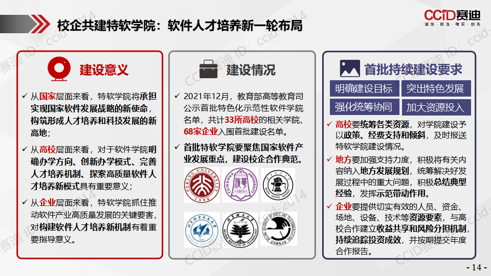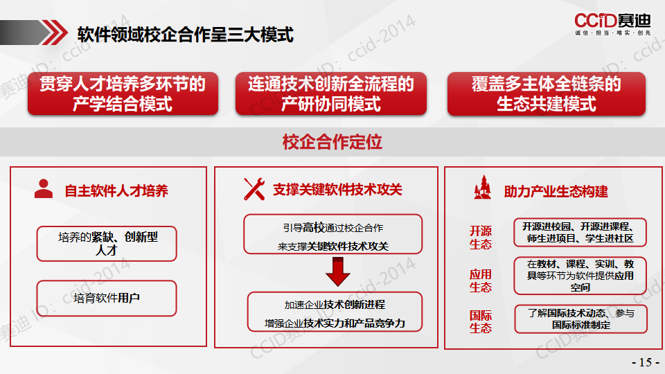 2023年8月20日,在2023年第十二届中国软件杯大学生软件设计大赛颁奖仪式上,赛迪研究院院长张立发布《新时期软件人才培养模式研究报告》。报告聚焦软件人才,提出了新时期软件人才新特点,总结了当前软件产业校企合作中值得借鉴的三大合作模式,为产学研各方提供参考。