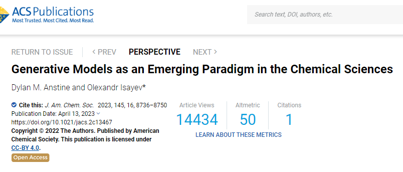 Anstine, Dylan M., and Olexandr Isayev. "Generative Models as an Emerging Paradigm in the Chemical Sciences." Journal of the American Chemical Society 145, no. 16 (2023): 8736-8750.
