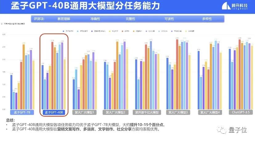 数据显示,孟子GPT-40B版本全面领先7B版本,大约提升10-15个百分点。