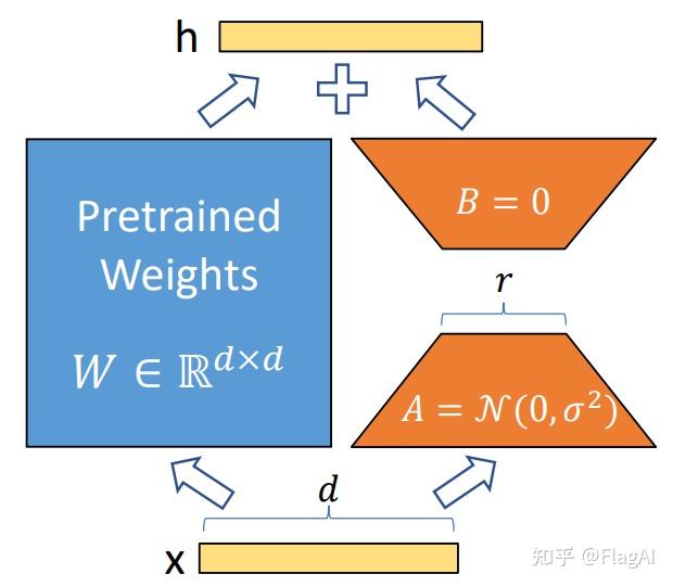 LoRA是一种轻量化的模型微调训练技术,它既加速了大模型训练,同时也降低了显存占用。LoRA的全称是Low-Rank Adaptation, 意思是降低训练过程中权重矩阵的秩来起到优化的效果。具体来说,全参数微调会训练attention里的QKV权重矩阵,这些矩阵通常来说很大,导致了巨量的训练成本。而LoRA会冻结这些权重,转而训练一个仅包含少量参数的LoRA模块,如下图橙色部分所示。其原理是在中间插入一个维度低的瓶颈层,这样可训练的参数从dd变为了dr+rd。 因为r相对于d很小,所以可训练的参数量也大幅降低。