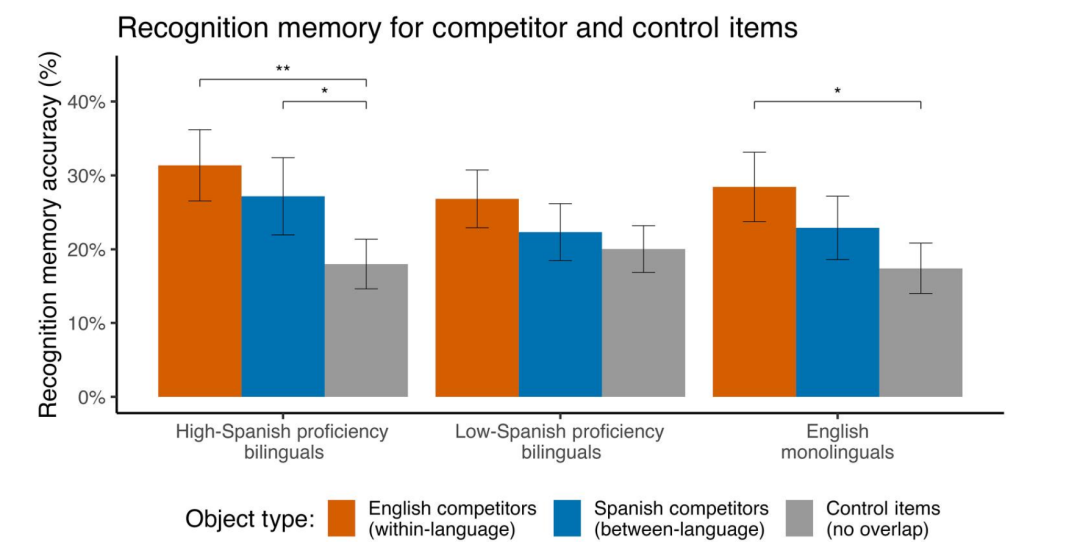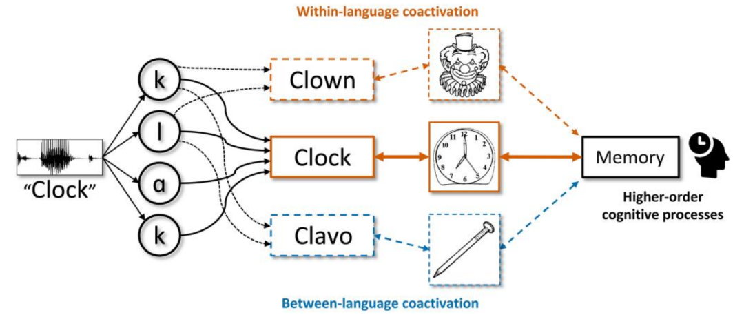 我们常常依靠语言来辅助记忆,借助词句描绘、分享见闻。语言与记忆、认知息息相关。语言相对性原理(The Principle of Linguistic Relativity)认为,“一个民族的世界观和价值观实际上是受自己语言所支配的。”不同语言如何影响到认知过程?习得多语言对认知有何影响?这些问题一直都备受语言学、脑科学、心理学等学科关注。收录于 Brain and Language 的《Memory after visual search: Overlapping phonology, shared meaning, and bilingual experience influence what we remember》论证了,激活单一语言中的竞争标签可以增强对相应视觉图像的记忆,双语在决策、创造力和记忆等高级认知领域发挥着重要作用。当单语者(monolingual)听到一个单词,又恰巧认识一些和它发音相近,但意思迥异的词时,在识别出正确单词之前,会先激活几个相关的候选词,也就是竞争词(competing words)。比如英语“clock”(时钟)和“clown”(小丑),这被称为语言内的竞争(Within-language competition);与之不同的是双语者,除了需要识别正确单词之外,还得先判断这是什么语言。比如英语“clock”(时钟)与西班牙语“clavo”(钉子)对英语-西班牙语的双语者(bilingual)来说也在相互竞争,这被称为语言间的竞争(Between-language competition)。从发音相似的竞争词中识别正确单词的过程就叫语音竞争(phonological competition)。语音竞争的双语效应已经有了很多研究,但我们仍对持续接触两种语言竞争词的长期认知结果知之甚少。最近发表在 Science Advances 的一篇文章关注不同语言体系对注意力和视觉记忆的影响,测试了掌握多种语言是否能通过共同激活语言内部和跨语言重叠部分来提高语音竞争词的视觉记忆。语言在大脑中是否激活可以通过跟踪眼球运动来研究。在视觉搜索(visual search)实验中,参与者听到一个词,然后在一组物体图像中寻找匹配项。当我们要求参与者找一个“西瓜”时,他可能会多看“南瓜”一眼,而不是“马车”。这样的实验或许能说明语音竞争能影响视觉搜索。这个实验依据语言将参与者分为三类,英语单语者,高西班牙双语者,低西班牙双语者。(高低是指参与者的西班牙语水平)每组42人,由此进行语言内实验和语言间实验的控制。参与者首先依据听觉目标完成视觉搜索任务,同时跟踪他们的眼球运动,之后再完成一个识别任务。他们采用广义线性混合效应模型,以识别记忆准确性作为二项结果变量,研究双语、语音竞争和眼睛注视对项目记忆的影响。他们发现高西班牙语水平也增强了西班牙语选手的记忆能力,认为语言多样性在一定程度上解释了记忆等高级认知功能的差异,多语言为研究语言与认知之间的相互作用提供了良好的基础。