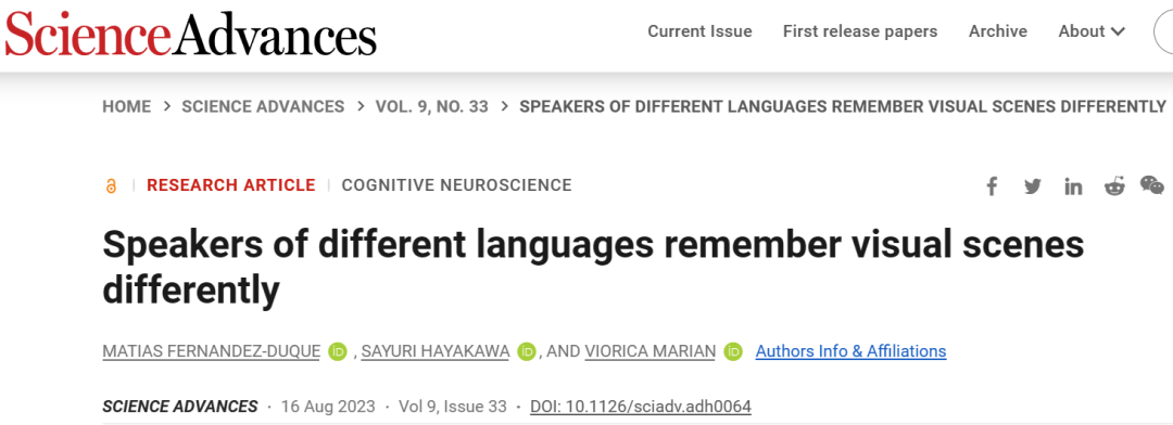 论文题目:Speakers of different languages remember visual scenes differently论文链接:https://www.science.org/doi/full/10.1126/sciadv.adh0064