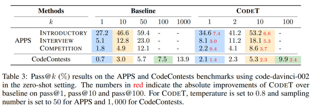 各种模型在HumanEval和MBPP基准测试上的实验结果总结在表2中。如果将基准列中的pass@100与pass@1进行比较,可以清楚地看到前者明显优于后者,表明CodeT有潜力从生成的100个样本中选择最佳的代码解决方案。