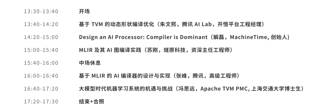 9 月中旬,TVM Meetup 第 3 站线下聚会定档深圳,这次我们邀请到了 5 位资深 AI 编译器专家,他们将在深圳腾讯大楼,为在场的朋友们带来精彩分享。