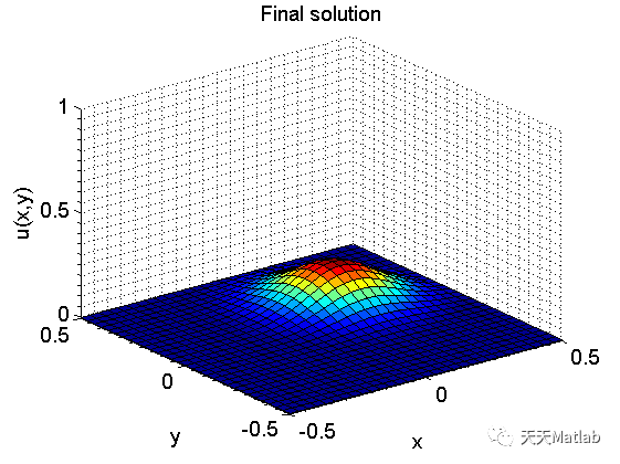 求解过程: 在求解过程中,我们首先需要确定求解域的大小和网格的划分。然后,我们可以根据所给的初始和边界条件来初始化数值解。接下来,我们可以使用有限差分法来逐步迭代求解离散的方程组,直到达到所需的收敛准则。最后,我们可以使用matlab中的可视化工具来绘制数值解,并进行结果分析。