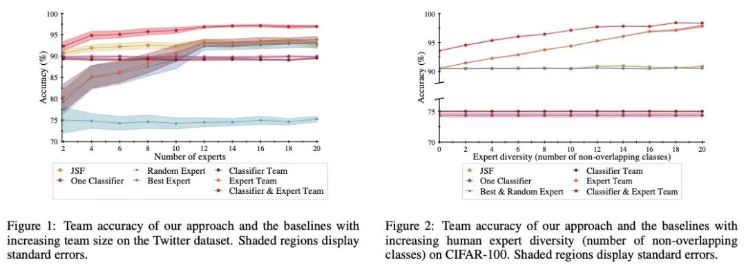 论文涉及的问题是在与人类专家共同工作的应用领域中,如何构建机器学习模型以补充多个专家的能力。之前的研究主要集中在只有一个不同专家的场景上,但实际情况中可能有多个能力不同的专家可供选择。为了解决这个问题,该论文提出了一种训练分类模型的方法,使其能够补充多个人类专家的能力。通过与分配系统一起进行联合训练,分类器学习准确预测那些对人类专家来说很难预测的实例,而分配系统学习将每个实例分配给最合适的团队成员,可以是分类器或某个人类专家。该方法在多个实验中使用“合成”专家的公共数据集和由多个放射科医生注释的真实医疗数据集进行评估。该方法优于之前的研究,比最好的人类专家或分类器更准确。此外,该方法适应能力强,可以灵活地适应不同规模和不同水平的专家多样性的团队。